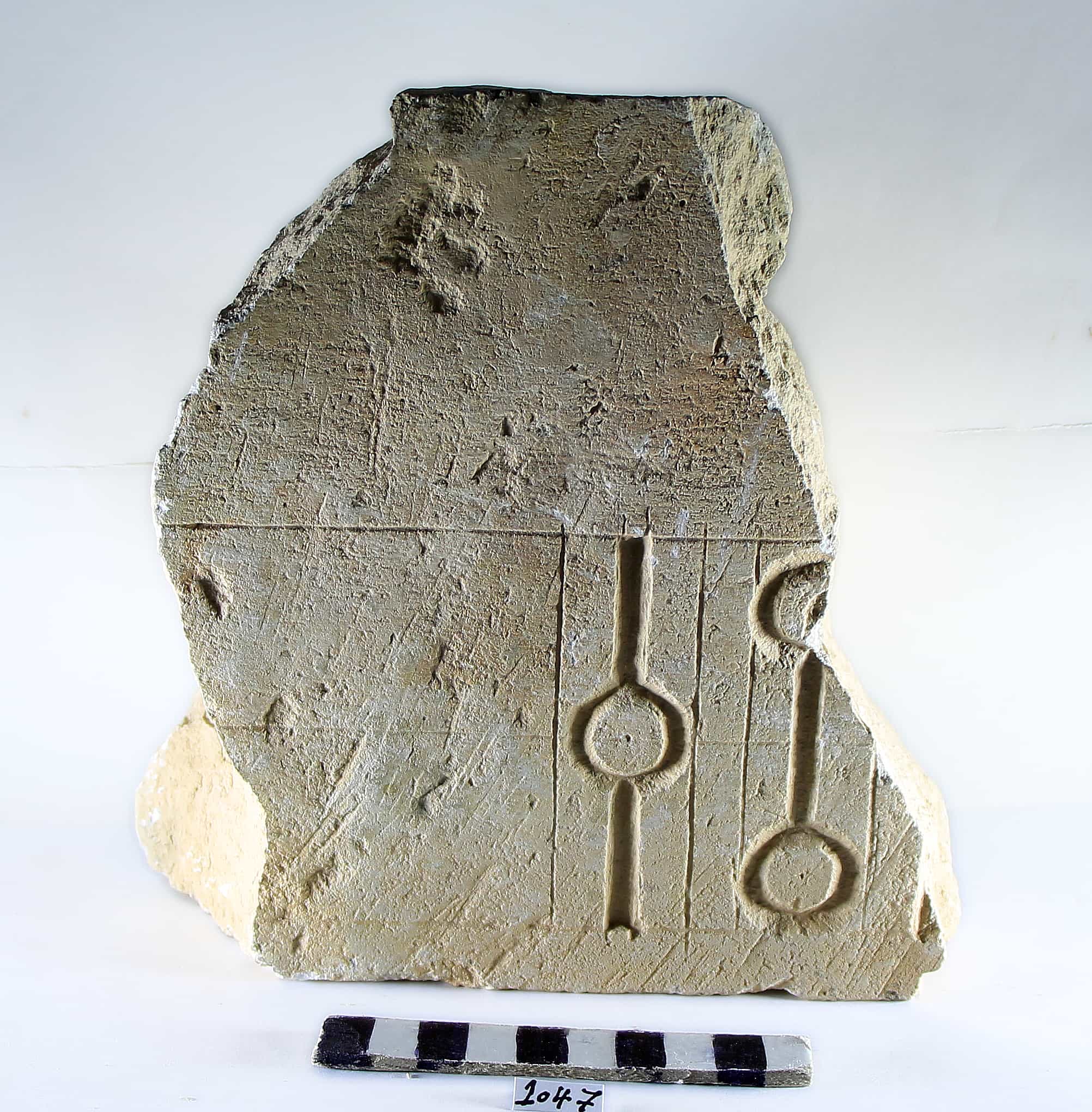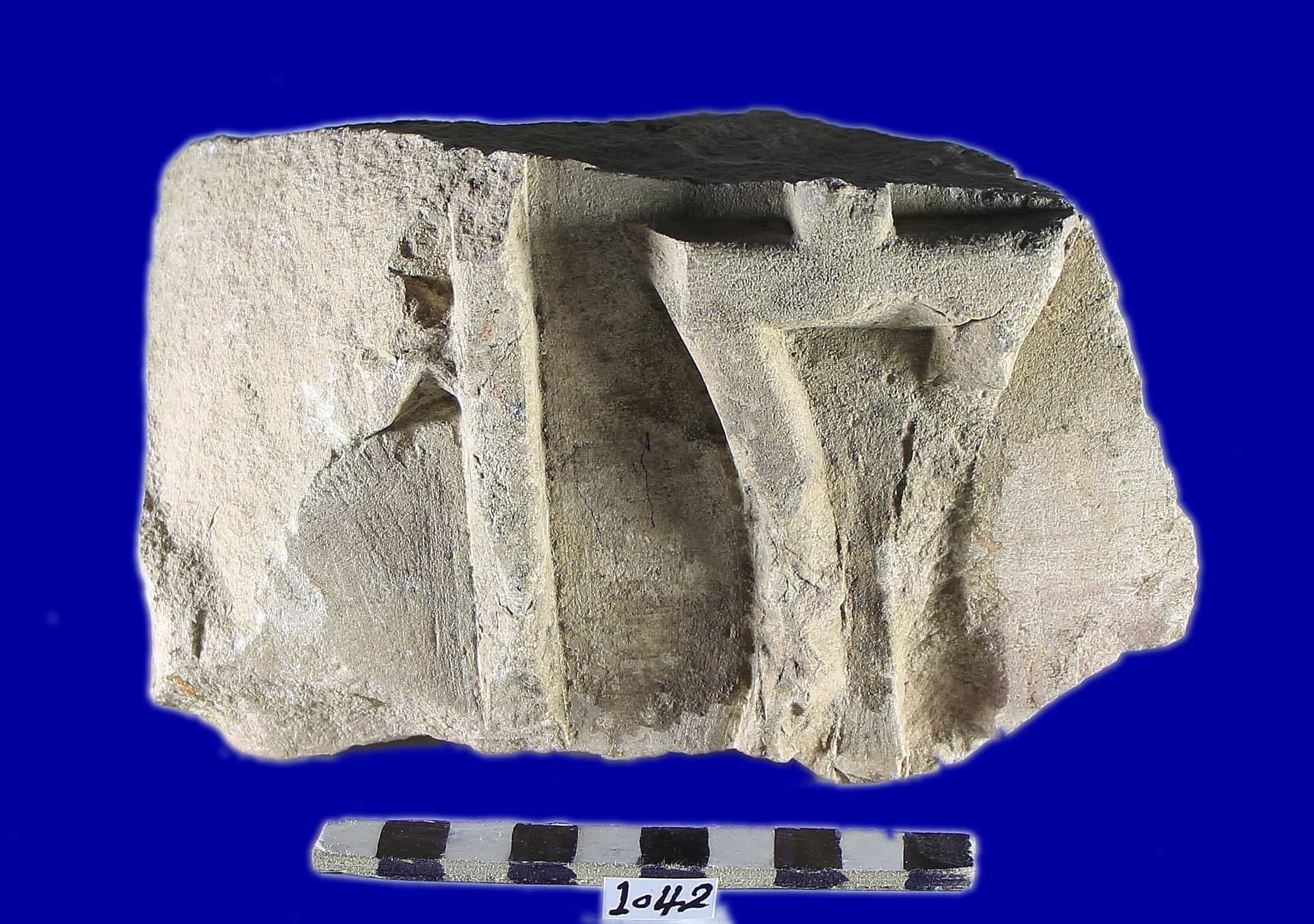 جزء من قطعة غير منتظمة الشكل عليها حرفين بالمسند نصه