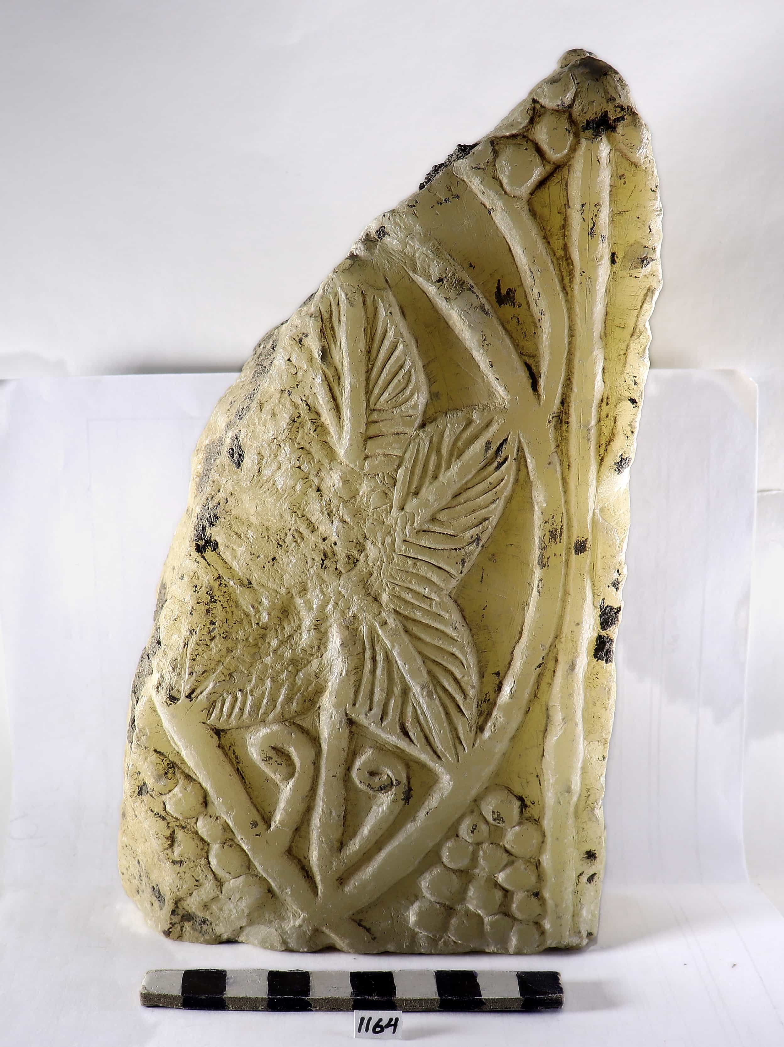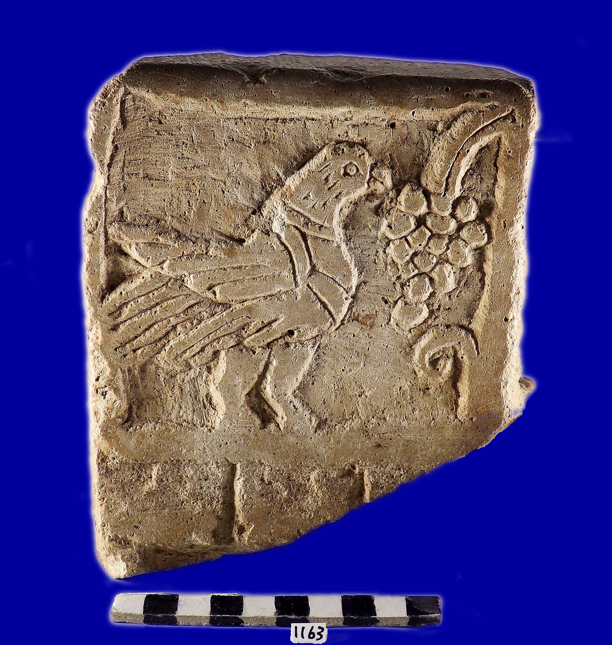 قطعة غير مكتملة عليها نحت لطائر امامه عنقود العنب