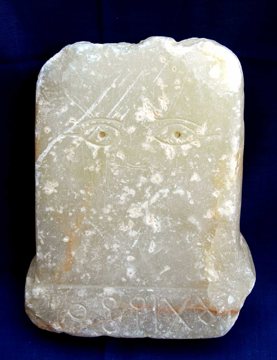 لوحة عليها نحت لعينين وعلى قاعدتها سطر بخط المسند