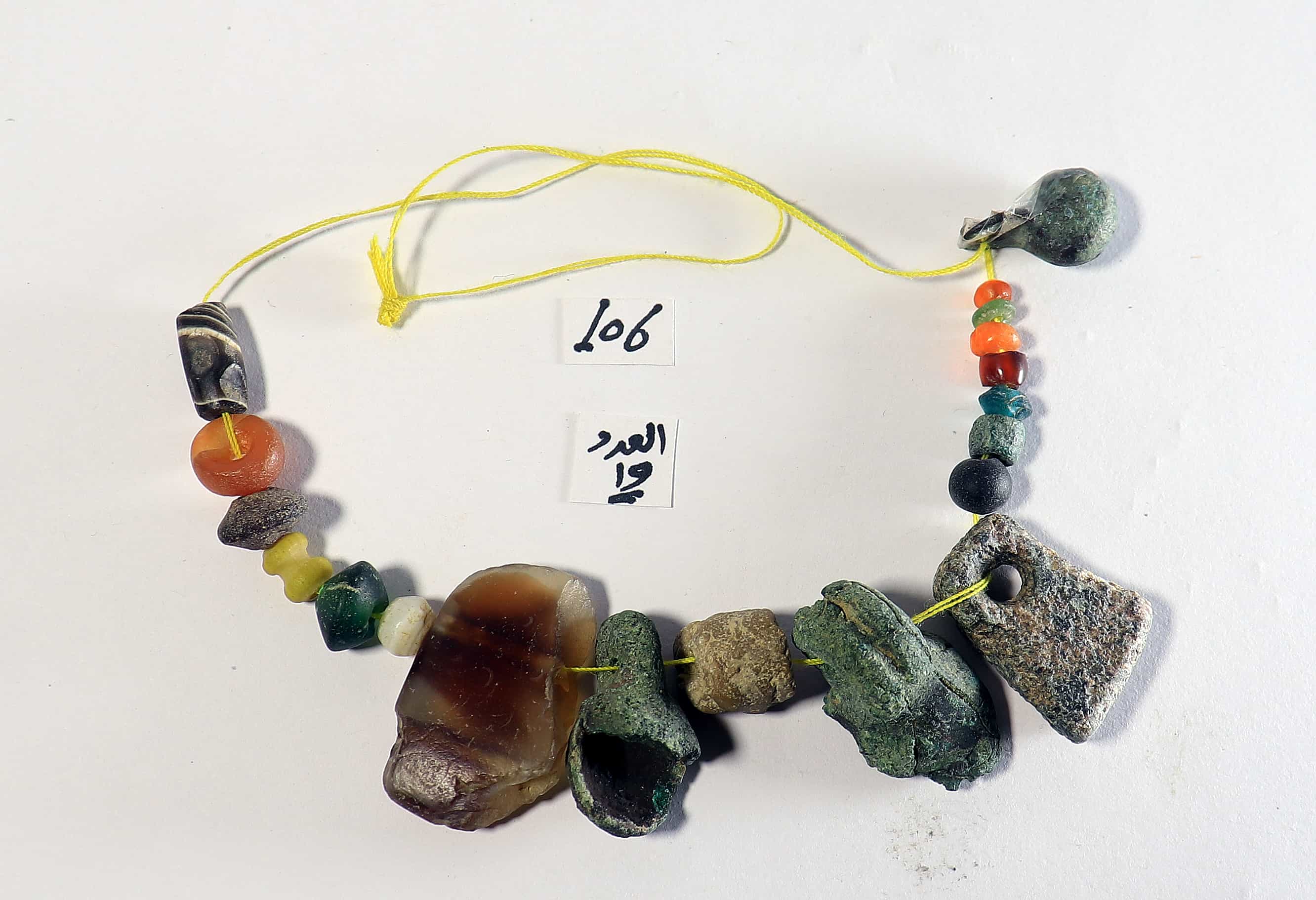 مجموعه من الخرز من الاحجار الكريمه والبرونز والحجر مختلفه الاحجام والاشكال والالوان عدد 16
