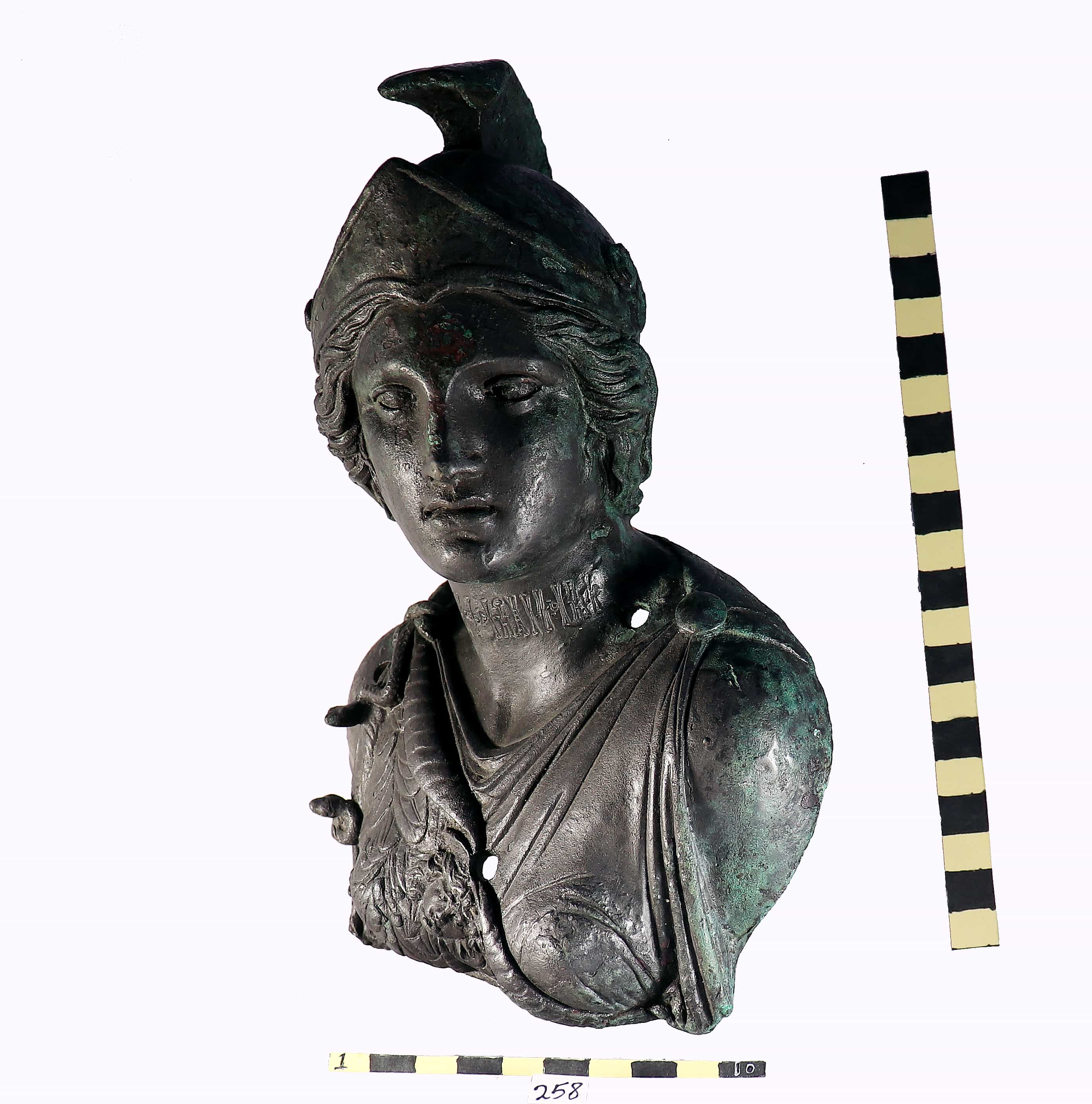 تمثال نصفي لأمراة بشكل محارب والمعروف بأسم الملكه نادين ملامح الوجه واضحه وبنسب تشريحيه دقيق وغاية الجمال والابداع ,يلتف الراس قليلا جهة اليسار ,ملامح الوجه واضحه ومكثمله ,الانف طويل عريض نسبيا من اسفل العنيين لوزيه الشفاء سميكه غير منطبقه , الشعر ممثل وم