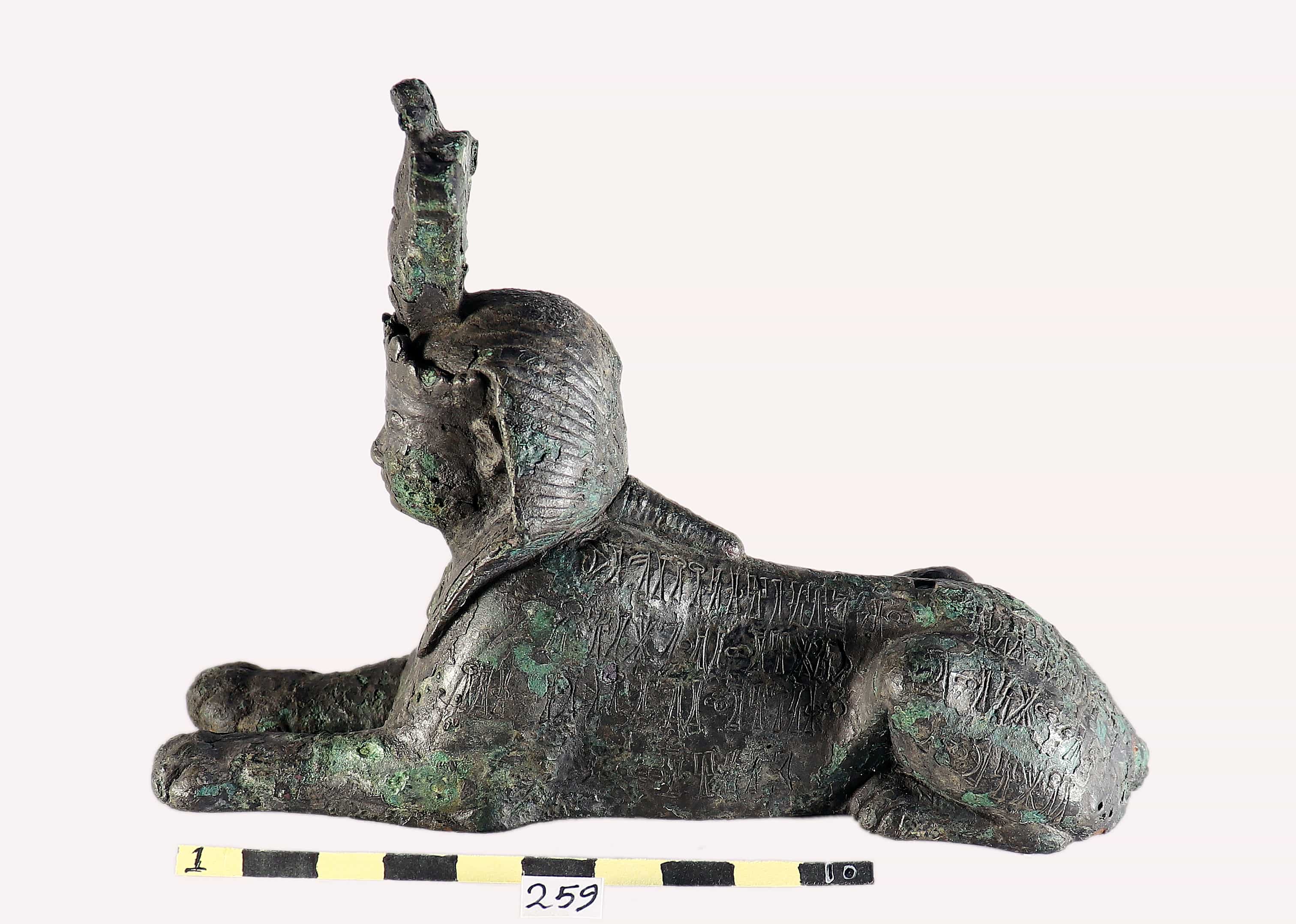 تمثال لحيوان رابض بجسم اسد ووجه أدمي على راسه تاج يمثل التمثال مجوف من الداخل ابو الهول , الوجه واضح المعالم الانف حاد وبارز العينين لوزيه الاذان بارزه وواضحه اليدين ممدوده الى الامام والرجليين مثبته الى البطن الذيل يلتف جهة اليمنى البدن عليه كتابه بالخط
