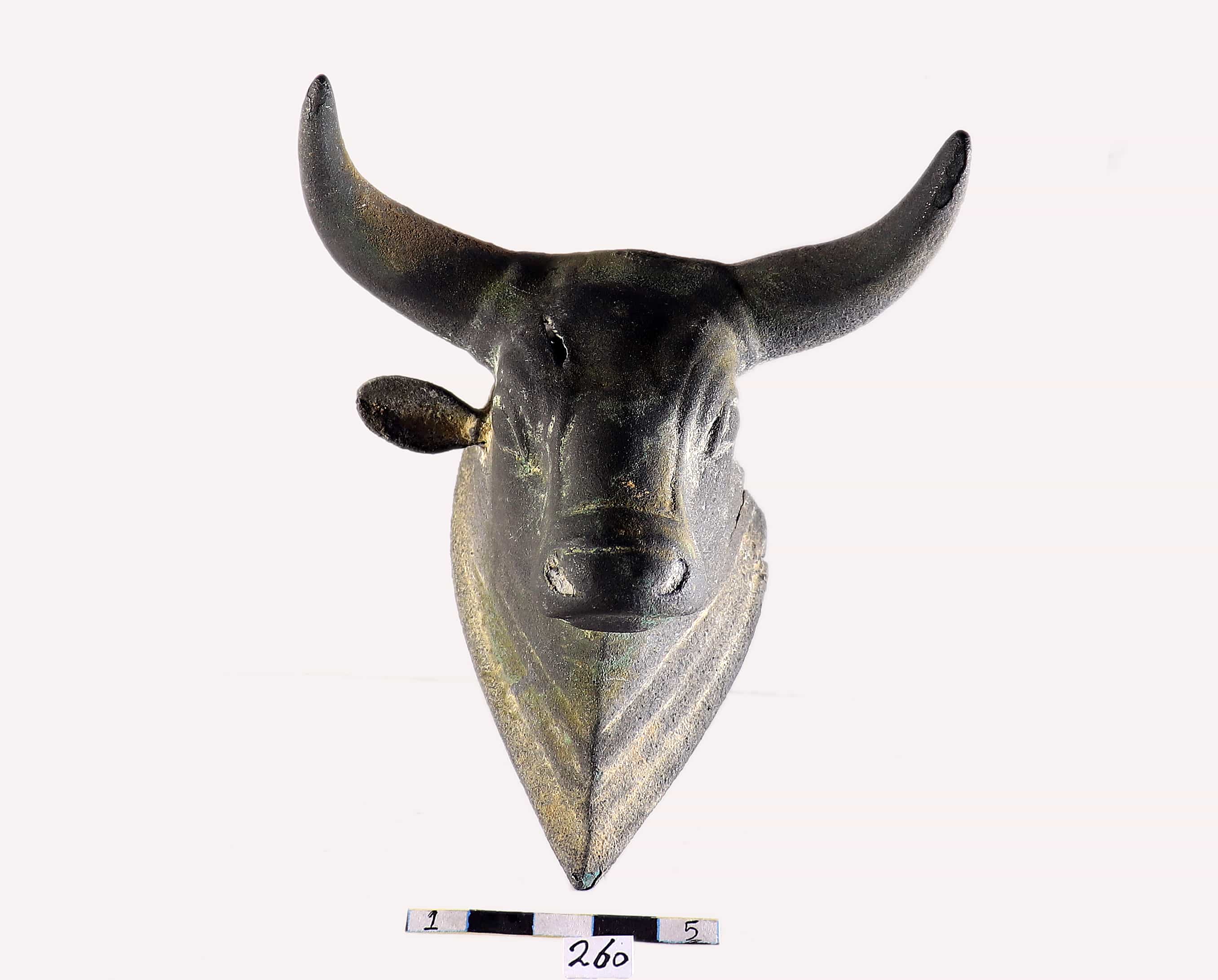 رأس ثور مجوف من الداخل له رقبه مثلثه الشكل عليها خطوط محزوزه غائره ملامح الوجه واضحه ومكثمله العينين لوزيه الانف عباره عن ثقوب محشوة منحنيه قليلا الفم عباره عن خط غائر نصف دائري القرون بارزه ومنحنيه قليلا الى الامام الاذن اليمنى ممثله تشبه الورقه , النبات