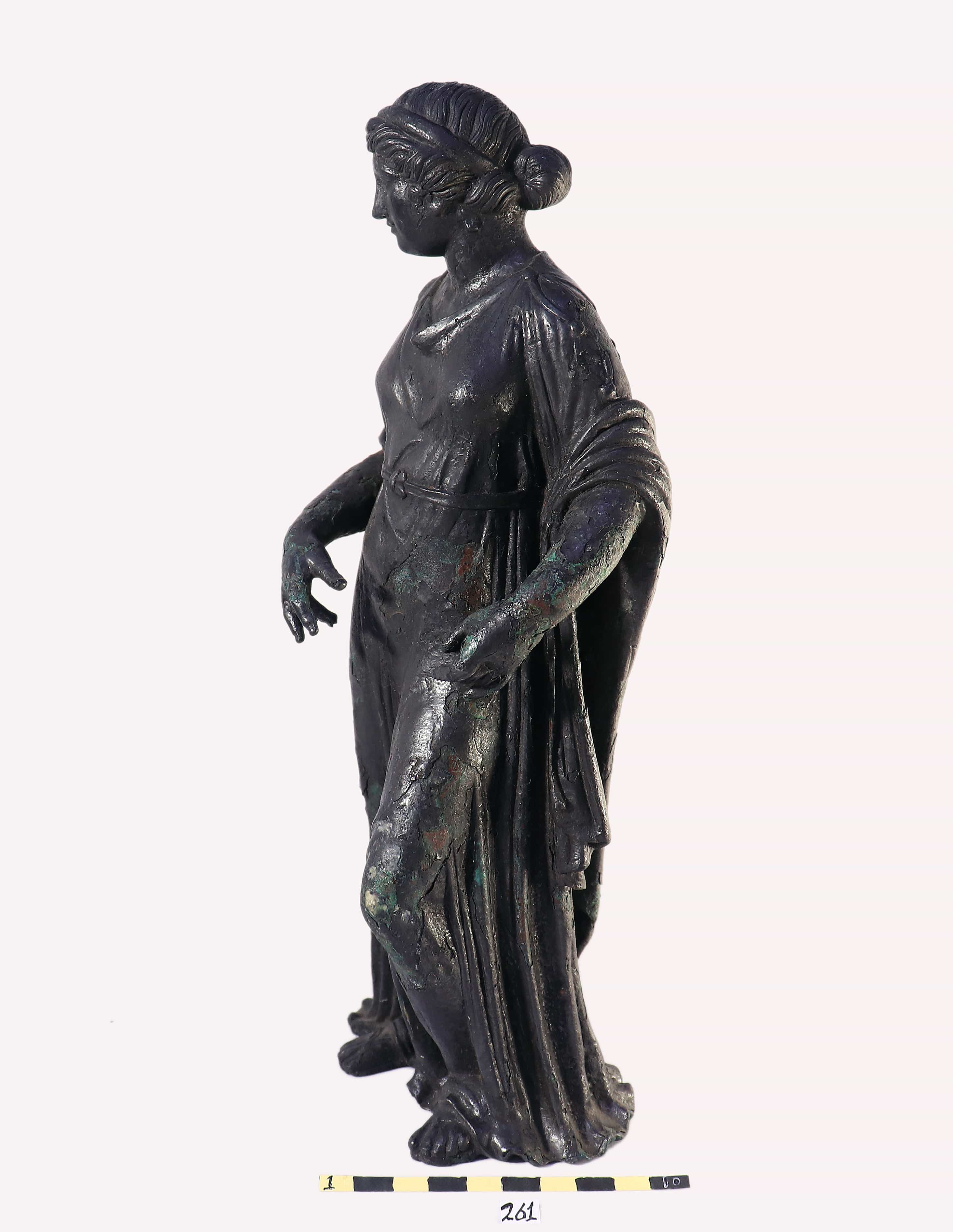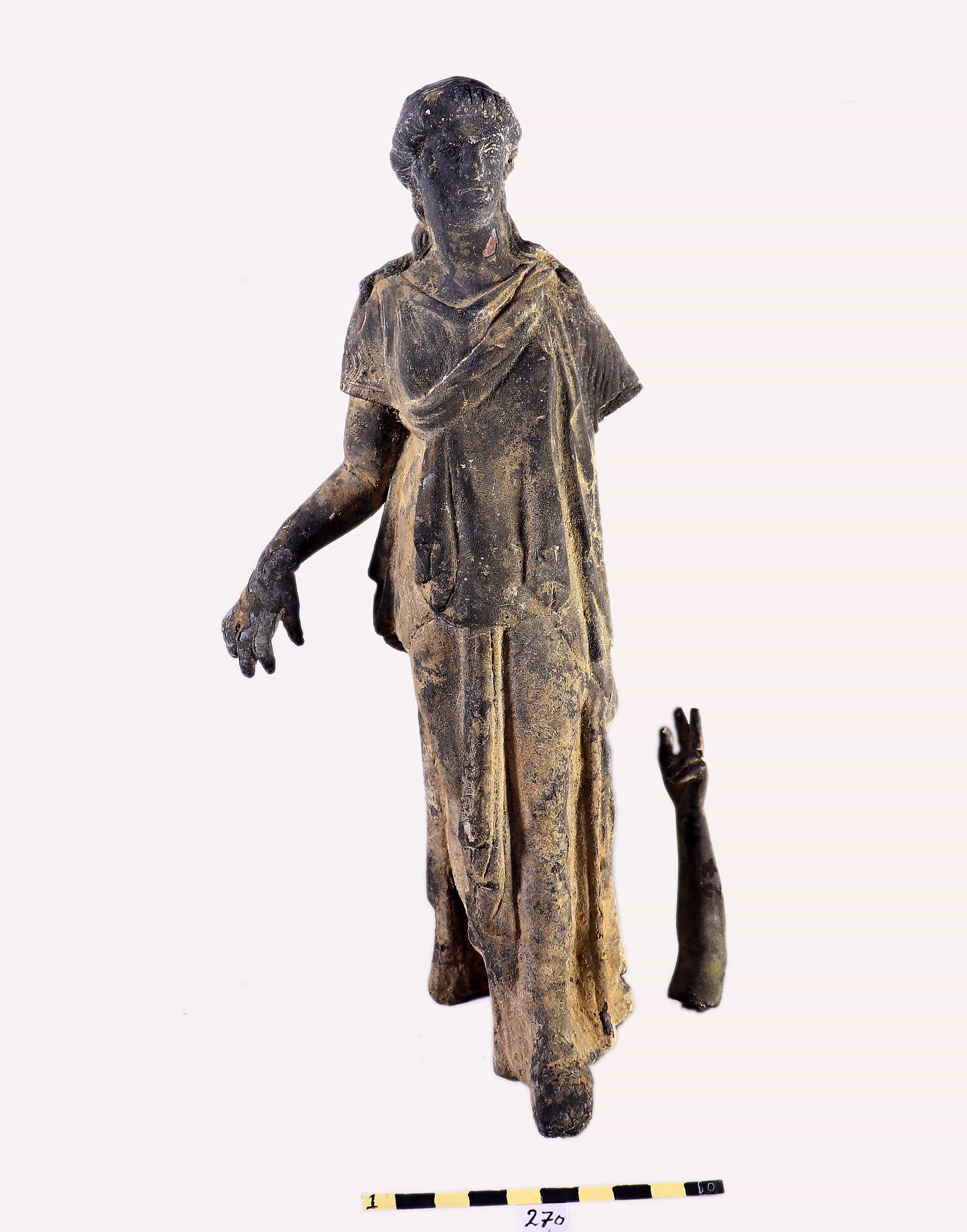 تمثال لامراة بشكل واقف اليد اليسرى مكسوره وموجوده الى جانب التمثال والرجل والجزء الاسفل من الجهة اليمنى مكسور ومفقود ترتدي ثوب , الوجة واضح المعالم الانف حاد وبارز ,العينين لوزيه ,الشفاء غليظه غير منطبقة,الشعر مظفور الى الخلف وخصلتين من الشعر تمتد الى الك