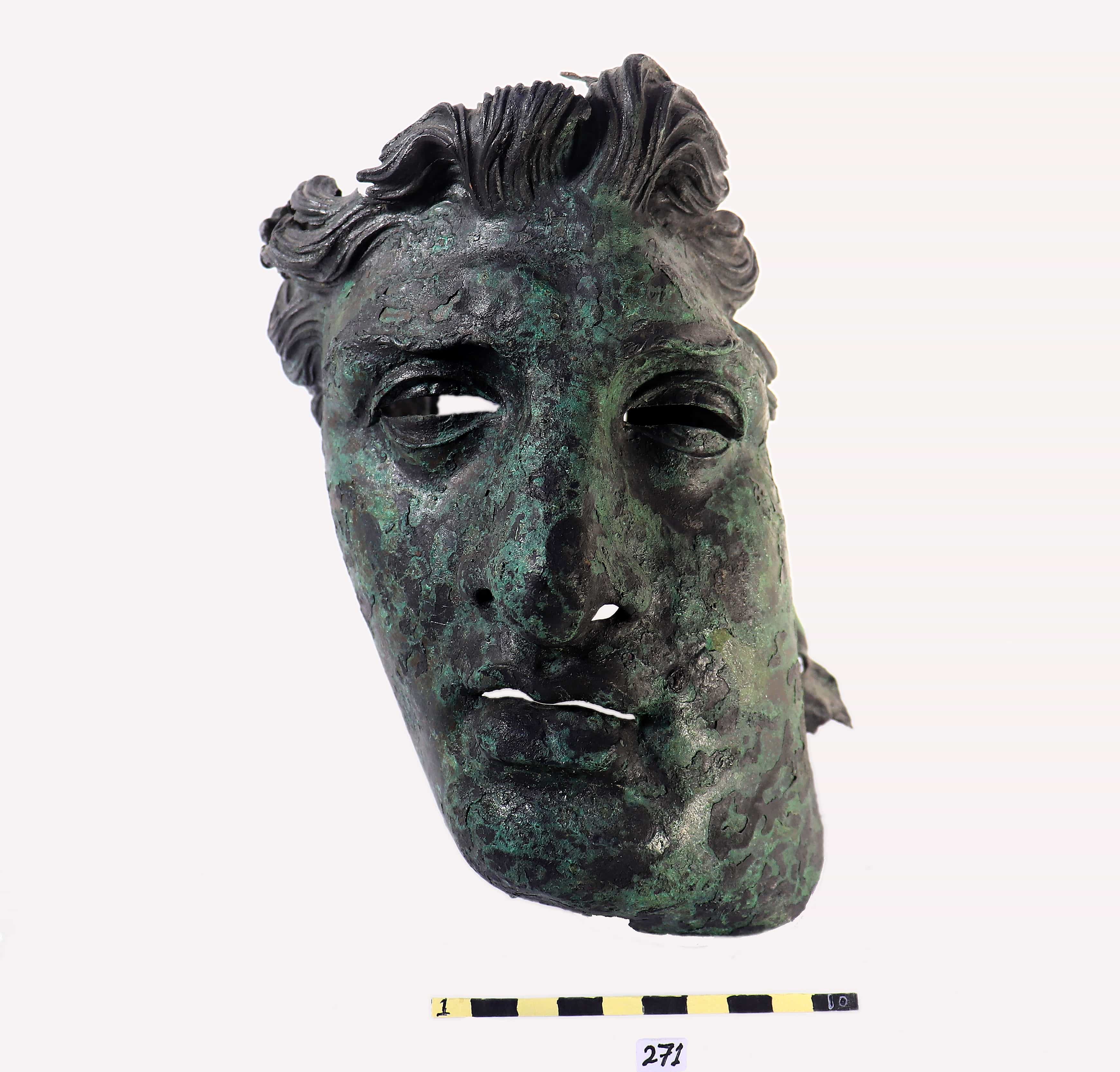 وجه أدمي واضح المعالم عباره عن قناع مهشم معالم الوجه واضحه ومكثمله الانف حاد وبارز وفتحات الانف مثقوبه ثقوب نافذه العينيين لوزيتان مثقوبه ثقوب ونافذه الشفاء غليظه غير منطبقه الفم مثقوب ثقب نافذ الشعر ممثل بارز ومتموج خصال الشعر تنسدل قليلا بجانب الاذنين ت