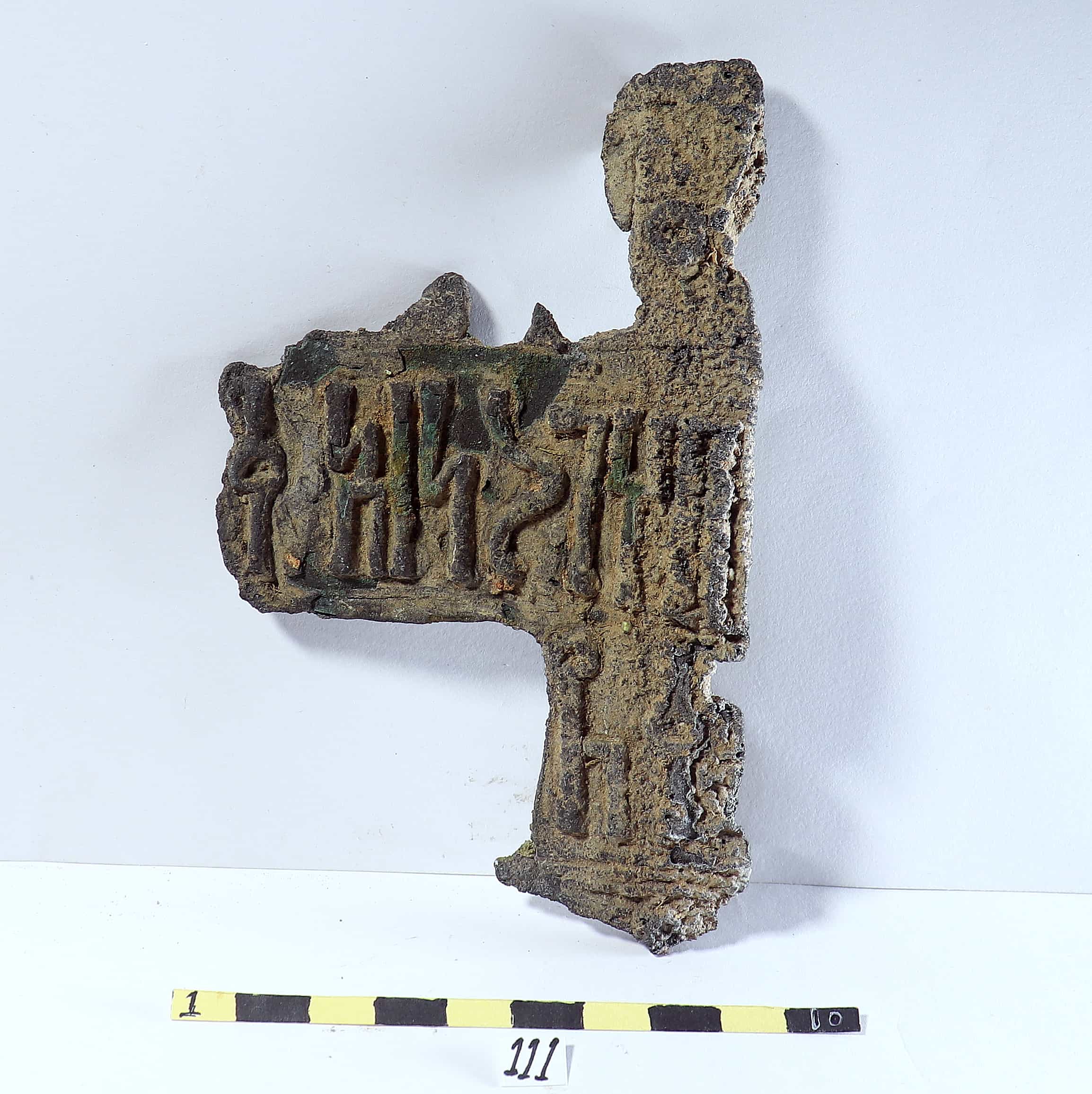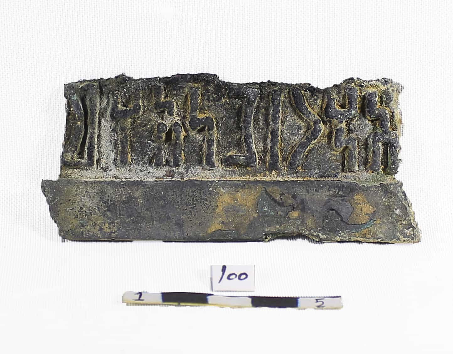 جزء صغير من نقش بخط المسند البارز على جزء من لوحه برونزيه عليه صداء البرونز يظهر منها اجزاء من ثلاثه اسطر