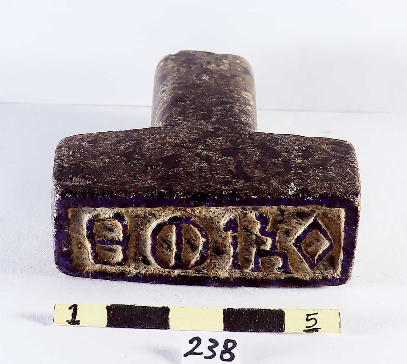 ختم مستطيل الشكل له مقبض اسطواني متصل في البدن كتب عليه احرف بالخط المسند البارز نصهاالختم مزور