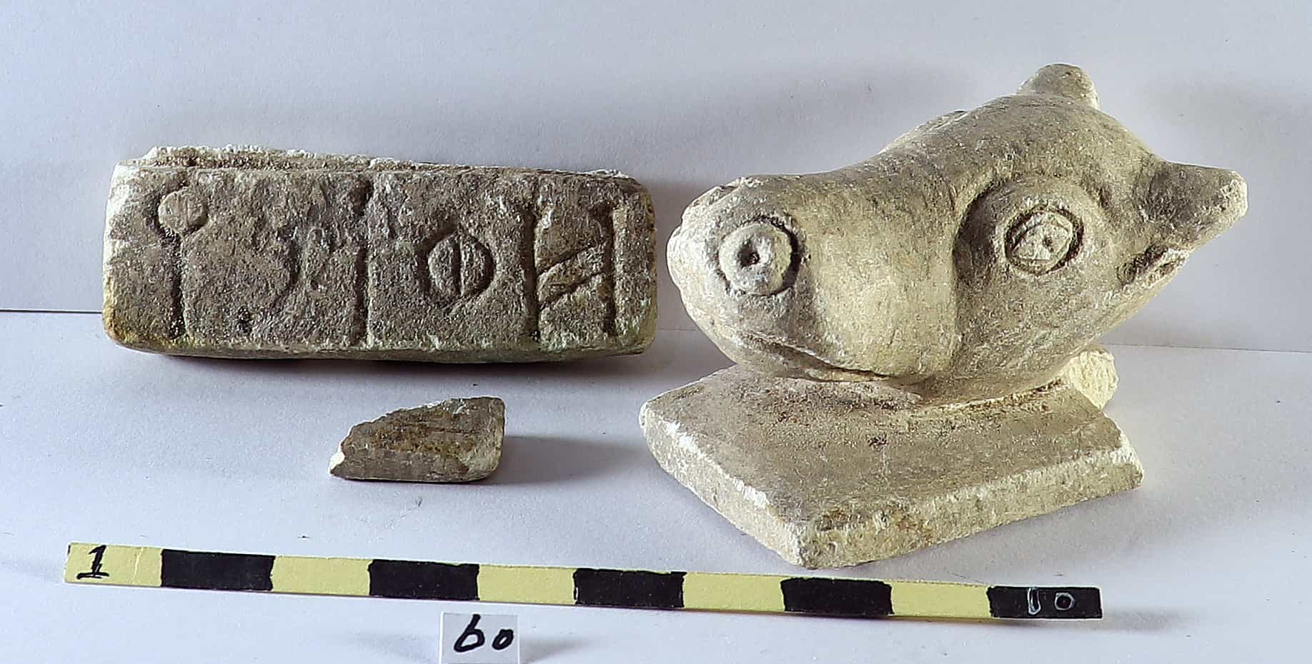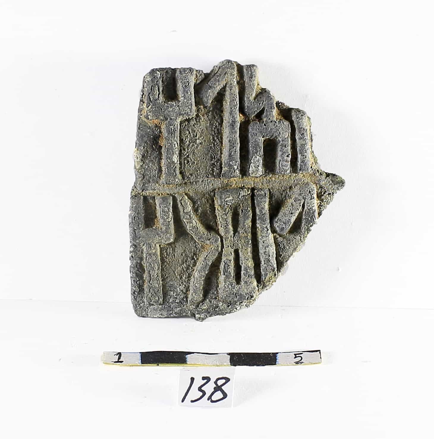جزء من قطعه صغيره على واجهتها بقايا سطرين بخط المسند نصها